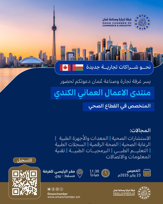غرفة تجارة وصناعة عُمان: تدعوكم غرفة تجارة وصناعة عُمان لحضور منتدى الأعمال العماني الكندي المتخصص في القطاع الصحي للتسجيل: https://forms.gle/2ZpTdetRPsmReeuD6...