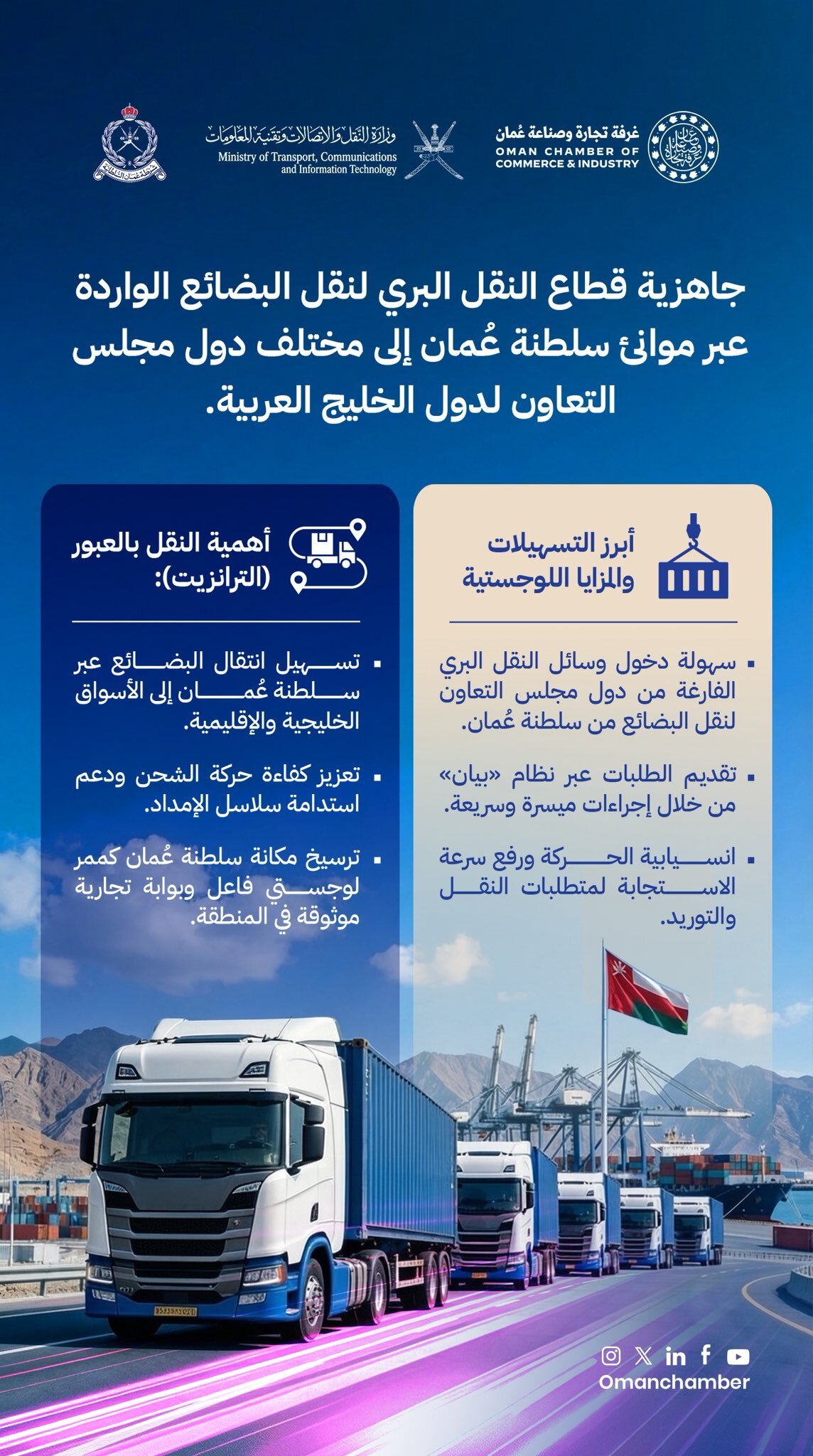 تعاون بين وزارة النقل والاتصالات وتقنية المعلومات وغرفة تجارة وصناعة عُمان وشرطة عُمان السلطانية لتعزيز جاهزية قطاع النقل البري في سلطنة عُمان لنقل البضائع الواردة عبر الموانئ العُمانية إلى مختلف دول مجلس التعاون لدول الخليج العربية، مع إتاحة تقديم الطلبات عبر نظام «بيان» بإجراءات ميسّرة تعزز انسيابية الحركة وكفاءة سلاسل الإمداد.