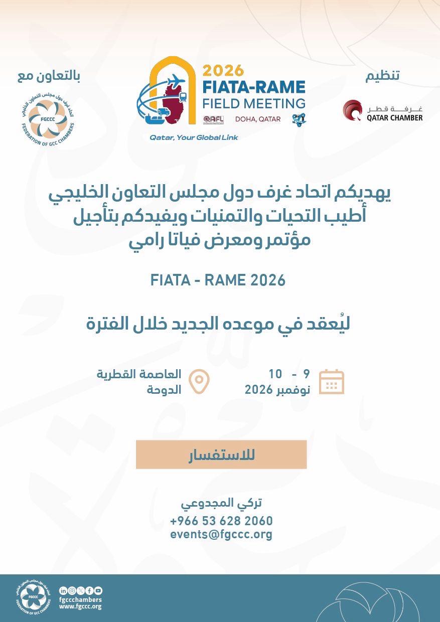 يسرّنا الإعلان عن مؤتمر FIATA RAME 2026، الحدث الدولي البارز الذي يجمع نخبة من وكلاء الشحن، ومزودي الخدمات اللوجستية، وصنّاع القرار، والجهات التنظيمية من مختلف دول إفريقيا والشرق الأوسط، تحت مظلة الاتحاد الدولي لوكلاء الشحن (FIATA).